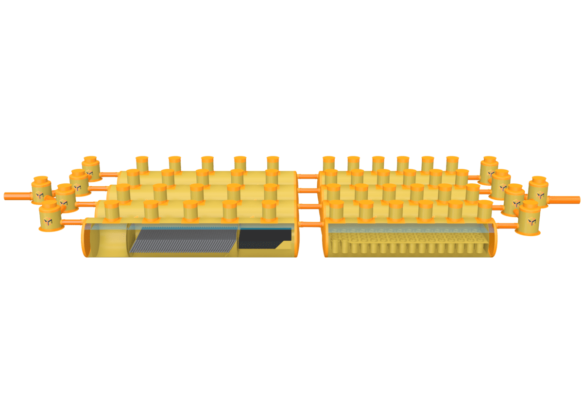 350 л/сек (1260 м3/ч)Стеклопластиковая ливневая канализация ЛК 350-2300 от компании М3Пласт полным объемом 373.7 м3 применяется для организации хранения дождевых стоков и талых вод. Производительность емкости 350 л/сек. Габаритные размеры резервуара М3Пласт ЛК 350-2300 составляют 12500*2300*2300 мм - 4 корпуса, 10000*2300*2300 мм - 4 корпуса. Объем корпусов ливневки 207.6, 166.1 м3. Сравнительно небольшой вес стеклопластикового резервуара относительно аналогов из металла и железобетона делает транспортировку, погрузочно-разгрузочные работы, монтаж и подключение более простыми. Конструкция подходит для подземной установки. Может эксплуатироваться как при низких, так и при высоких температурах.